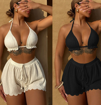 מלאי חדש ruffle לקצץ לסרוג 3 חתיכות ביקיני סט נשים חוף הלבוש החוף קצר